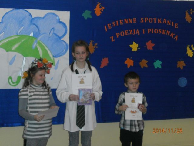 Podczas tej uroczystości przeprowadzono wewnątrzszkolny konkurs recytatorski pt.,,Jesień w poezji” .W konkursie udział wzięło 23 recytatorów z kl. O-VI.